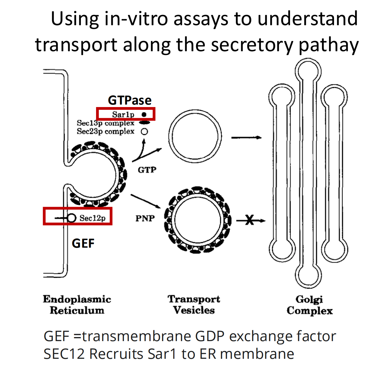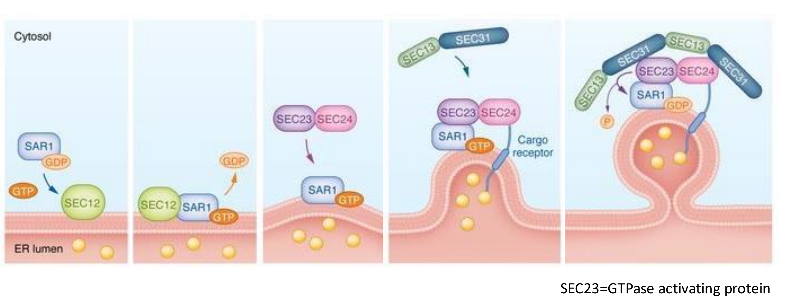 • Sec12 – This is an ER-resident integral membrane protein that functions as a Guanine nucleotide Exchange Factor (GEF) for Sar1. Sec12 catalyzes the conversion of inactive Sar1-GDP (guanosine diphosphate) to its active Sar1-GTP (guanosine triphosphate) form. This activation is the initiating step for COPII coat assembly.