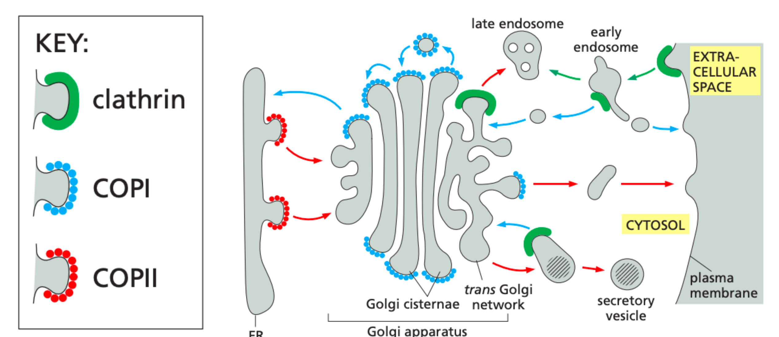 • From the TGN, proteins are sorted into different types of vesicles for delivery to their final destinations: secretory vesicles (for regulated or constitutive exocytosis to the plasma membrane), lysosomes (for degradation), or directly to the plasma membrane (for integral membrane proteins).