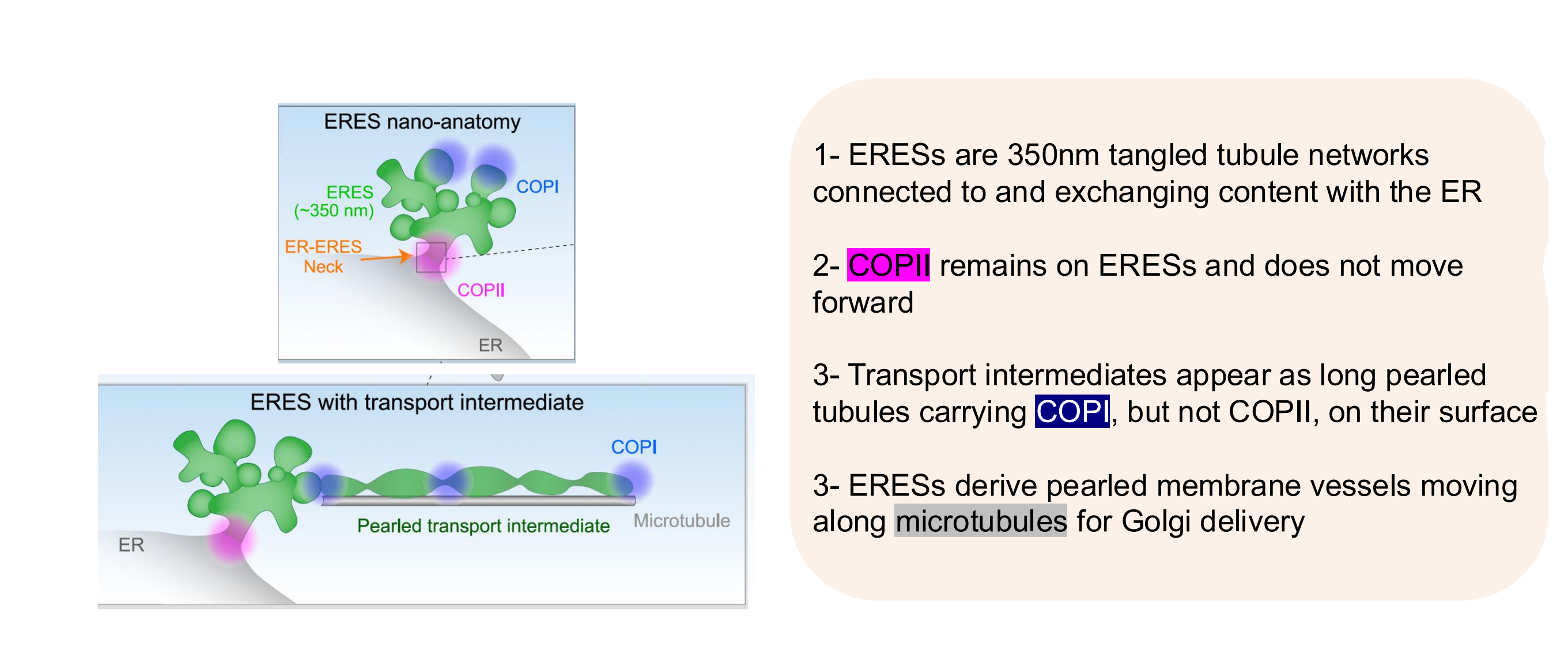 • Revised view: ER exports bulky cargo via megacarriers (tubulo-vesicular structures) rather than discrete 50\,\text{nm} vesicles: The discovery of these mechanisms has led to a revised understanding of large cargo export. It is now widely accepted that the ER does not exclusively rely on the budding of small, discrete spherical vesicles for all cargo. Instead, bulky cargo, such as procollagen or very large protein complexes, are exported within dynamic, elongated tubulo-vesicular structures often referred to as “megacarriers.” These structures are much larger than standard COPII vesicles and are better suited for accommodating large or elongated proteins, providing a more efficient means of transport.