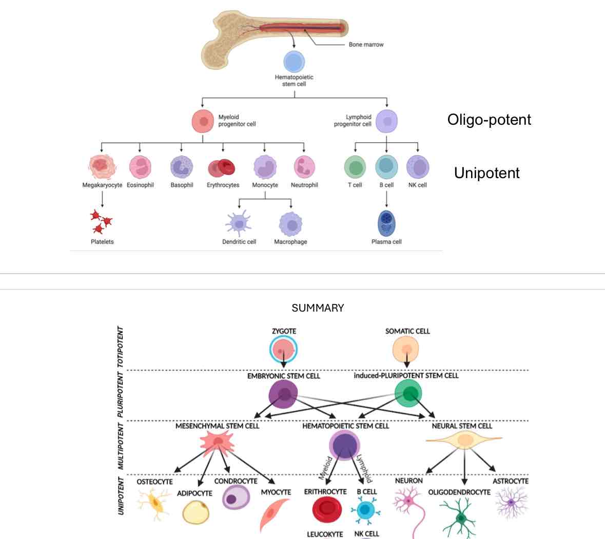 Zygote, Somatic cell, Embryonic stem cell, Induced pluripotent stem cell, Mesenchymal stem cell, Hematopoietic stem cell, Neural stem cell, various differentiated cell types.