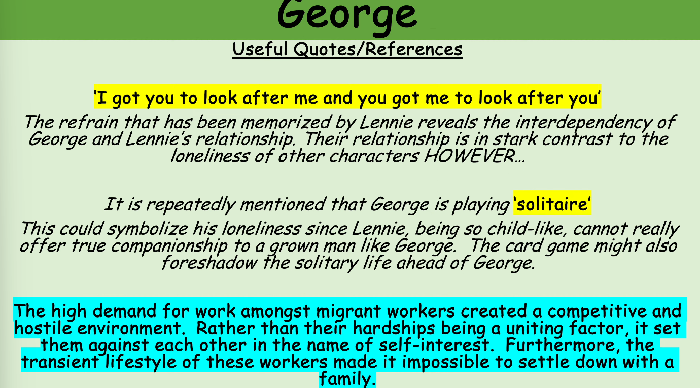 There is a contrast with George and Lennie having a friendship, the boss is suspicious of George as he doesn’t see friendship among itinerant workers he sees loneliness. the quote “I got you to look after me and you got me to look after you”, was memorised by Lennie which creates the contrast of loneliness, you could say they are lonely together. You could support that with the repeated mention of George playing Solitaire which is a game you play on your own which could symbolise the loneliness of George. The card game could foreshadow the solitary life ahead of George. The high demand for work amongst migrant workers created a competitive and hostile environment. Rather than their hardships being a uniting factor, it set them against each other in the name of self-interest. Furthermore, the transient lifestyle of these workers made it impossible to settle down with a family.