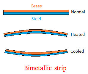 2 different metals stuck together, which expand at a different rate when heated. Below brass expands more when hot, and also shrinks more when cold.