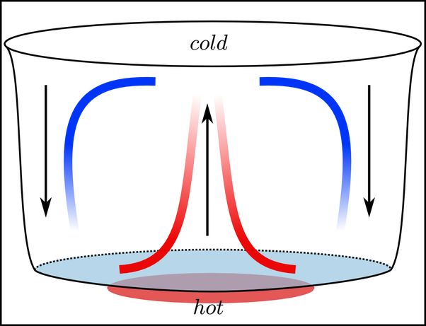 Liquid or gas particles near the heat source get hot, these particles have larger KE, so they need more space. So hot water expands, hence becomes less dense, and rises. Eventually the hot air cools down, becomes more dense and sinks ( on the other side of the container). The cold water will replace the hot water that has risen. This happens continuously, forming convection currents.