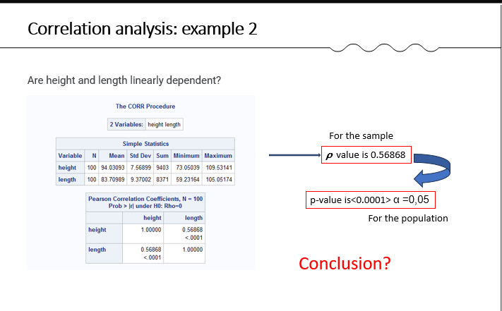 Conclusion: The p-value < 0.05 implies rejecting null hyp. There is significant evidence of a positive linear relationship between height and length in the population.