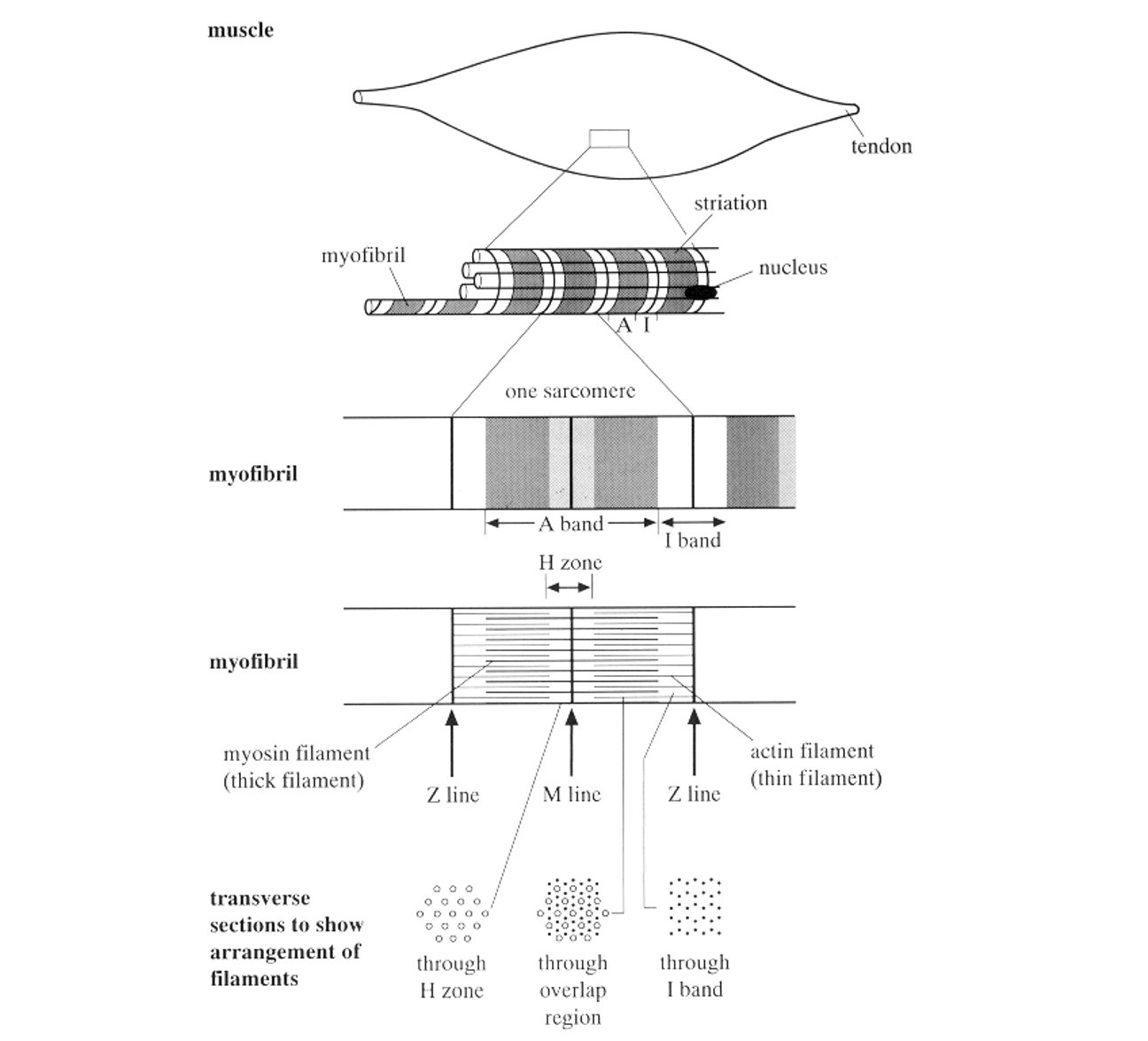 Muscle → Muscle fibre → Myofibrils → Sarcomere → Actin and myosin