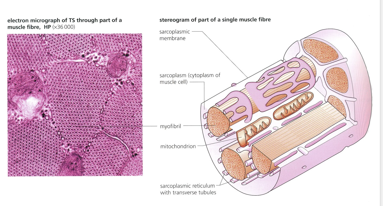 Inside each fibre cell there are many longitudinally running fibres called myofibrils and it’s these that give the characteristic striations (stripes)