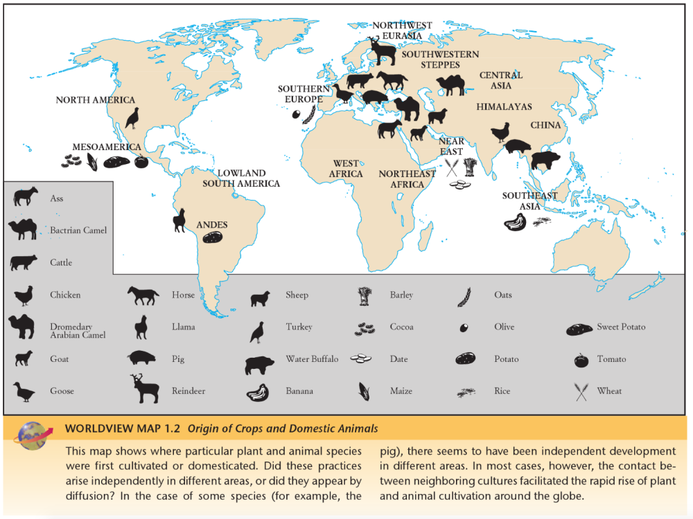 The emergence of principal crops is associated with major civilizations. Usually, the 1st crops to be domesticated were cereal (grass) or something starchy (EX: potatoes, or bananas) and then a legume (EX: common bean, adzuki bean, soybean, groundnut, or pigeon pea)