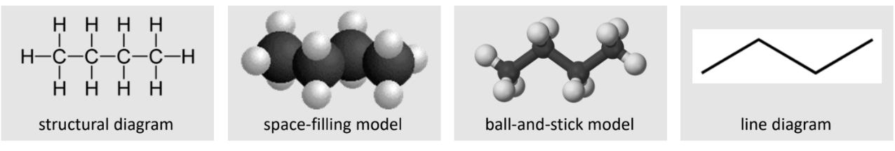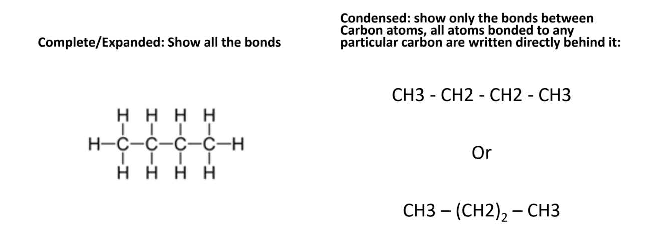 - Condensed: show only the bonds between carbon atoms, all atoms bonded to any particular are written directly behind it