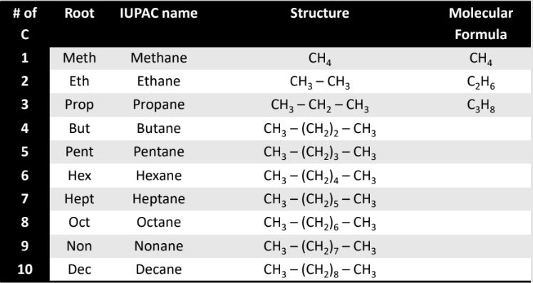 - Root: # of carbons in parent chain