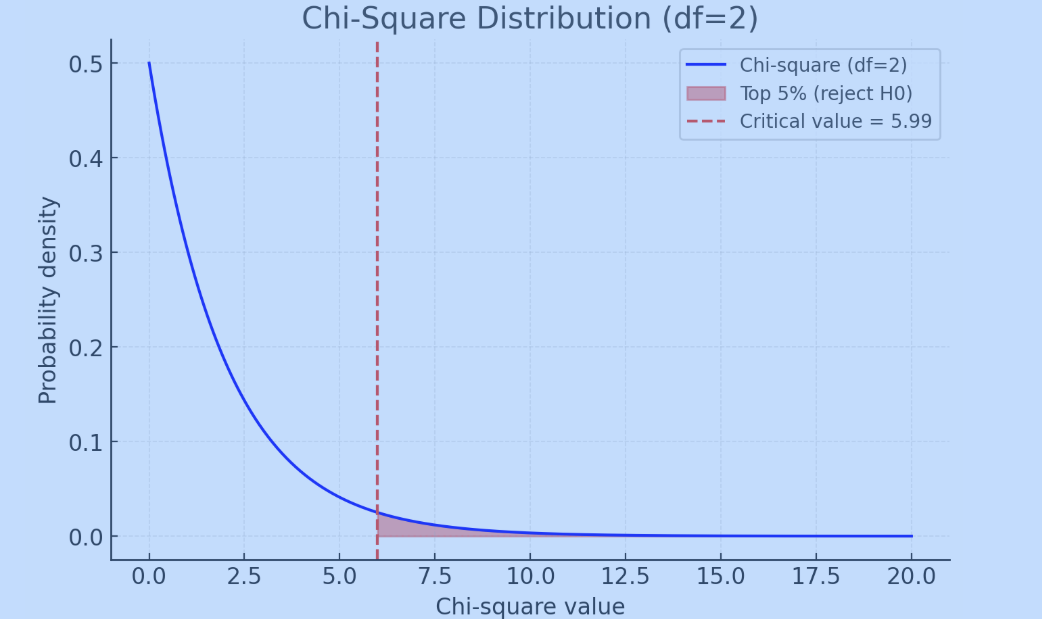 If our statistic falls before the red line that says there is no difference (null is true), but if our chi-square statistic is more than our critical t value, that indicates a difference (people prefer one of the locations more than the others)!