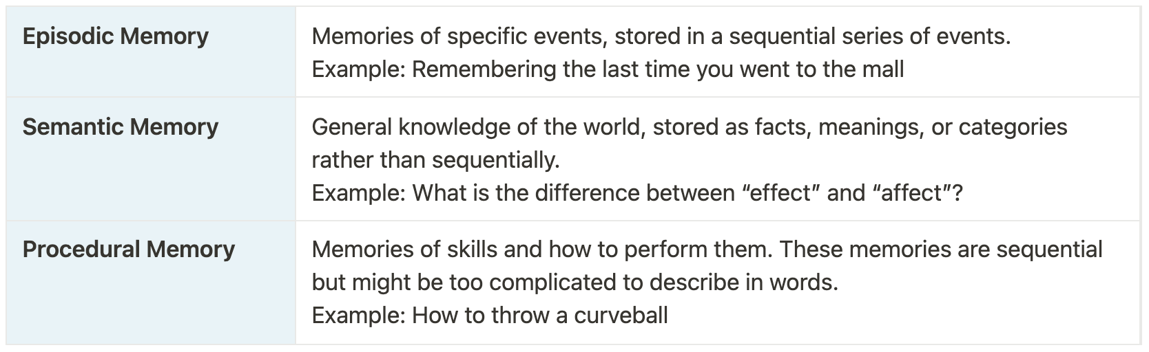 * Indicates that the memory for these skills, or procedural memory, is stored elsewhere in the brain