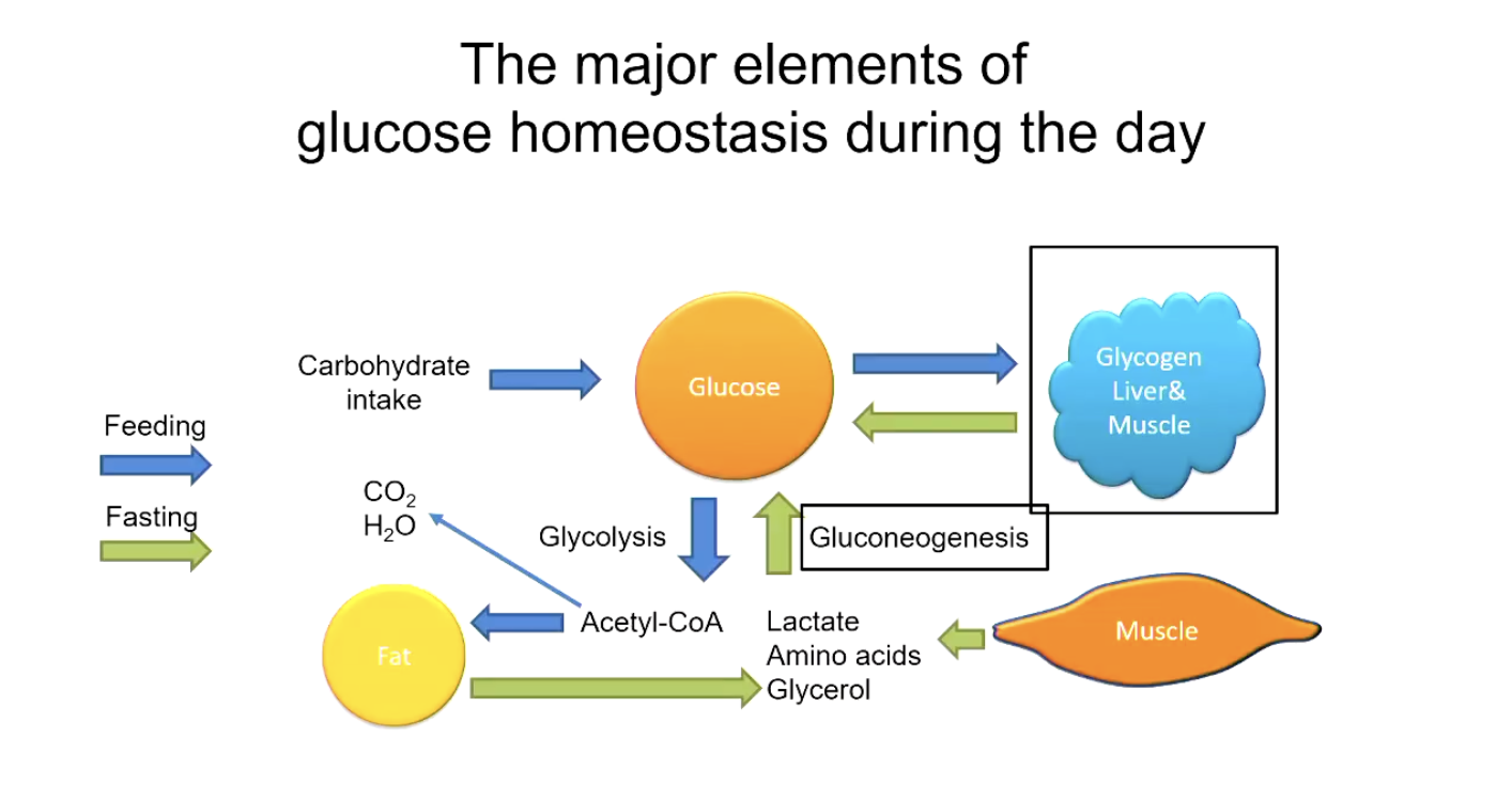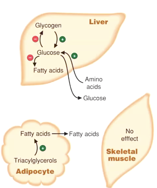 Crucial detail: Glucagon acts on liver & adipose, NOT skeletal muscle.