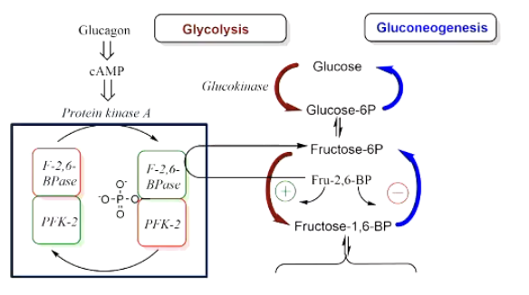 Bifunctional Enzyme PFK-2 / FBPase-2: Phosphorylation by PKA switches OFF kinase domain & ON phosphatase domain "\longrightarrow" "\downarrow F"2,6BP. This "\downarrow" PFK-1 (glycolysis) and "\uparrow" FBPase-1 (GNG).