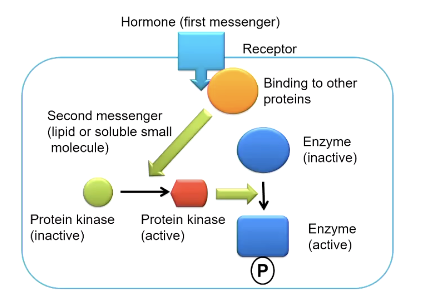 Protein kinase A (PKA) binds 4 cAMP → releases catalytic subunits → broad phosphorylation program.