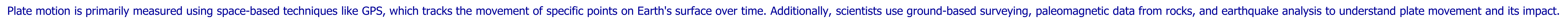 Plate motion is primarily measured using space-based techniques like GPS, which tracks the movement of specific points on Earth's surface over time. Additionally, scientists use ground-based surveying, paleomagnetic data from rocks, and earthquake analysis to understand plate movement and its impact.