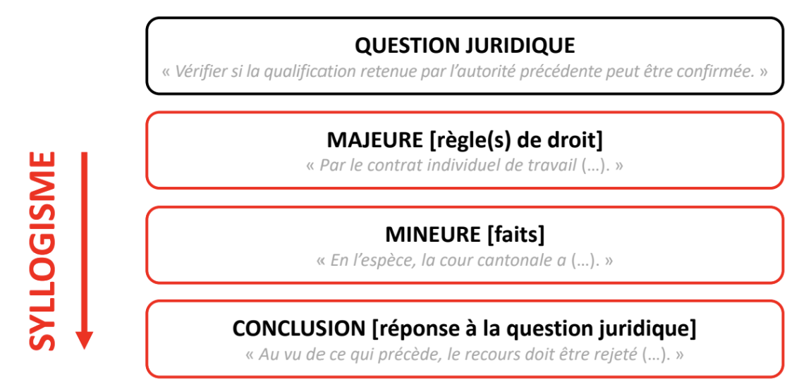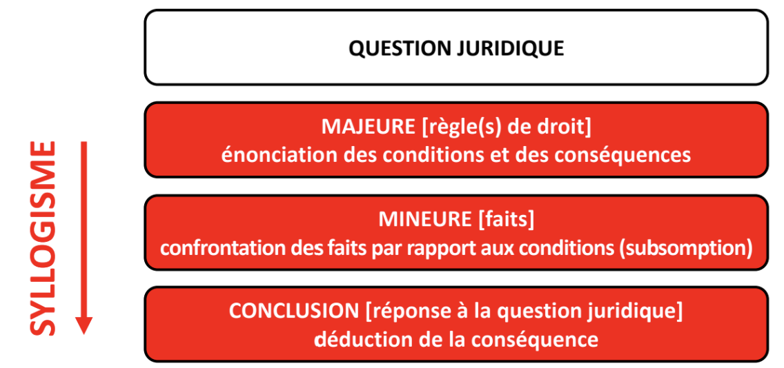 « Opération intellectuelle qui transpose une règle de droit à un état de fait pour en déduire une conséquence juridique. Le raisonnement syllogistique est fonctionnel si l’état de fait remplit toutes les conditions posées par la règle de droit. Il est structuré en trois parties : majeure, mineure et conclusion. » Bovet / Carvalho, p. 155