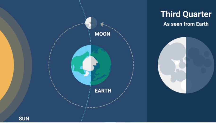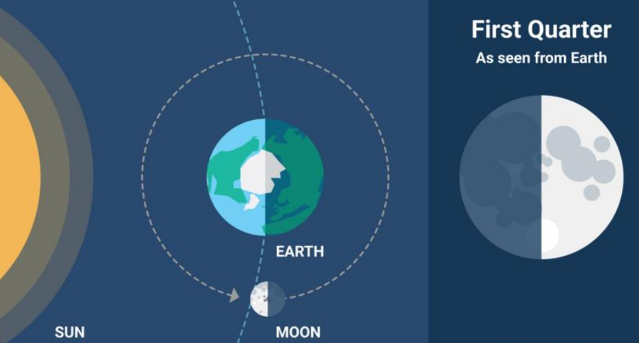 The Sun and Moon are at right angles to each other relative to Earth.