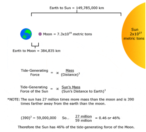 The sun's tide-generating force is about 46% that of the Moon.