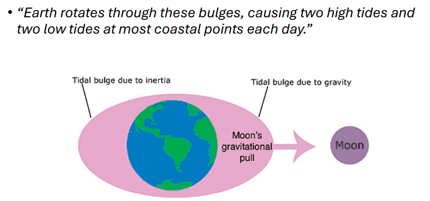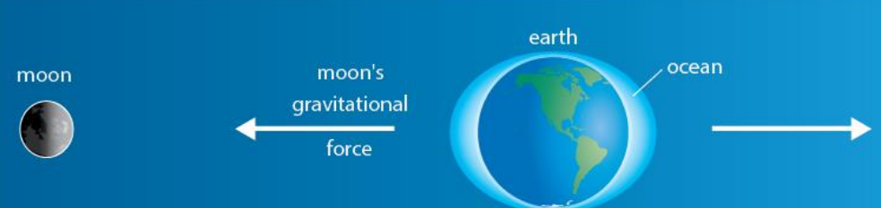 Gravitational Pull: The Moon pulls water towards the side of Earth nearest to it, creating a bulge or high tide.