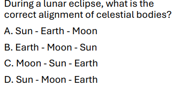 "Earth blocks sunlight from Moon" (occurs during a Full Moon).