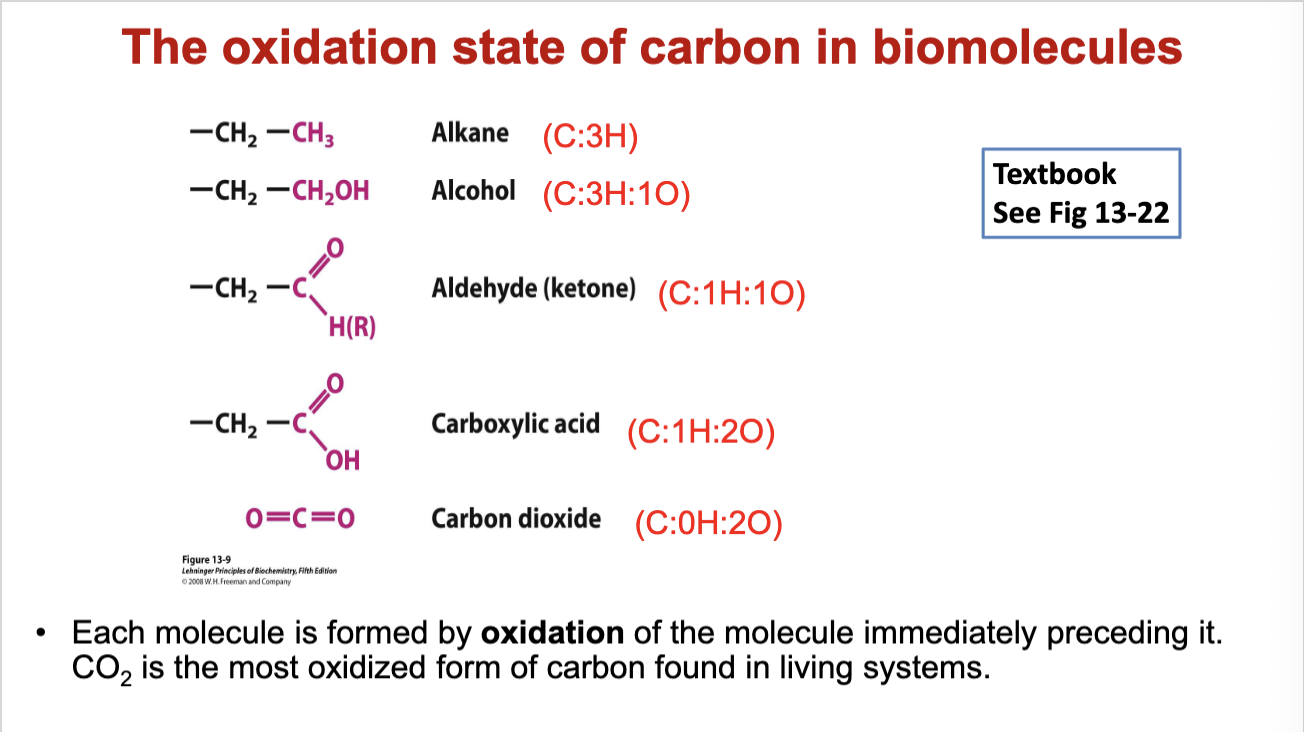 Oxidation states defined by the composition of hydrogens and oxygens attached to carbon.
