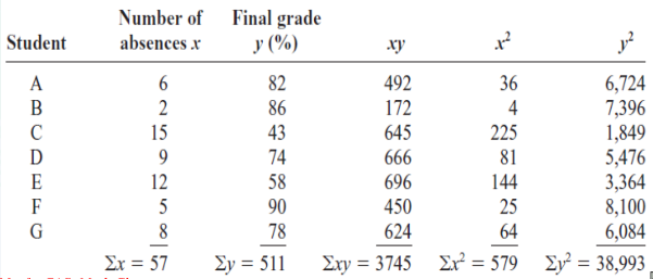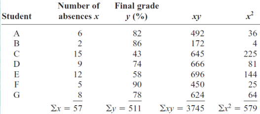 the number of absences and the final grades of seven randomly selected students from a statistics class. The data are shown here.