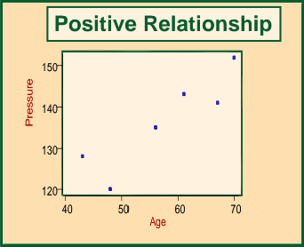 Positive relationship: If the points cluster in a band running from lower left to upper right, there is a positive correlation.
