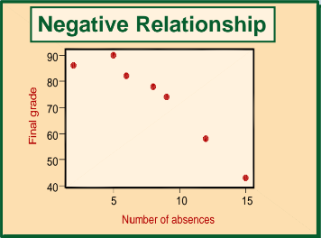 Negative relationship: If the points cluster in a band from upper left to lower right, there is a negative correlation.