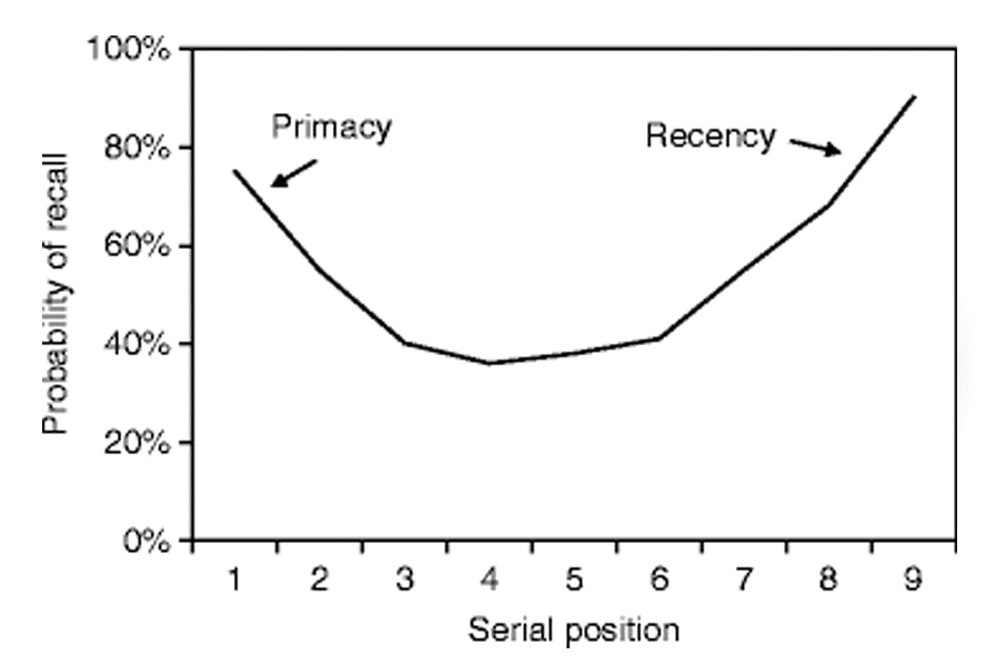 Primacy Effect- another cognitive bias that results in better recall for items at the beginning of a list or sequence.
