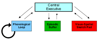 Baddeley's Working Memory Model- a theoretical framework that explains how the working memory system functions. It consists of three components: the phonological loop, the visuospatial sketchpad, and the central executive.