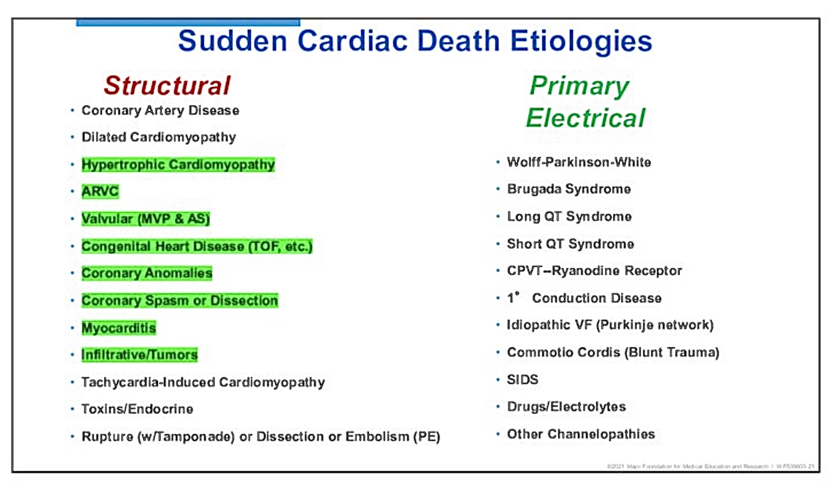 Discussion on sudden death epidemiology, workups based on nutrient characteristics, and defibrillator usage.