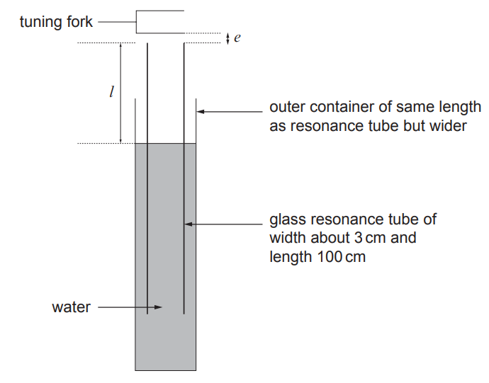 When resonance first occurs the length of air in the tube, l, plus a small end correction, e (to account for the position of the tuning fork above the tube) will be equal to a quarter of a wavelength. Hence: