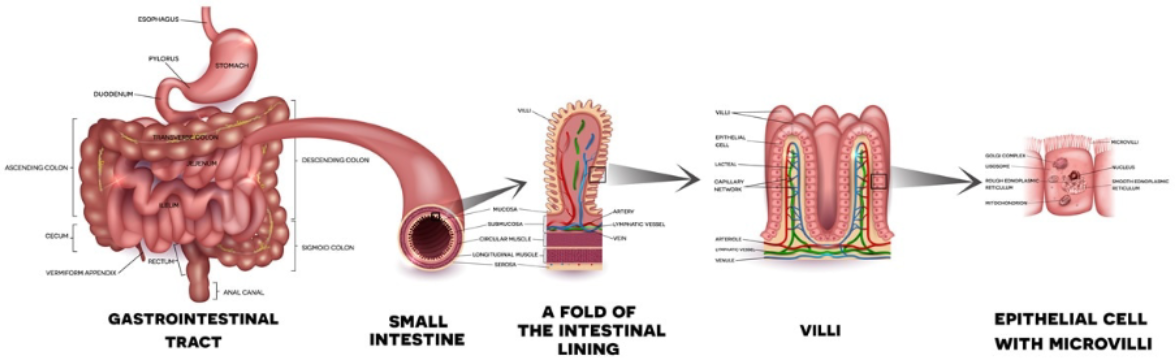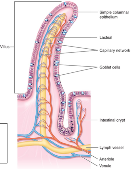 Transport absorbed materials to the blood or lymph system. Each villus is lined with a single layer of cells enterocytes (AKA epithelial cells): These are the primary absorptive cells for all nutrients. Each villus contains an arteriole, venule and lacteal providing access to the circulatory and lymphatic system