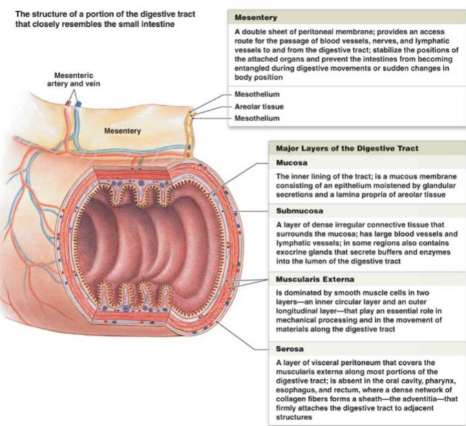 The two most active sites of digestion and absorption occur in the small intestine. The small intestine is made of layers. From inner most layer to outer most layer: