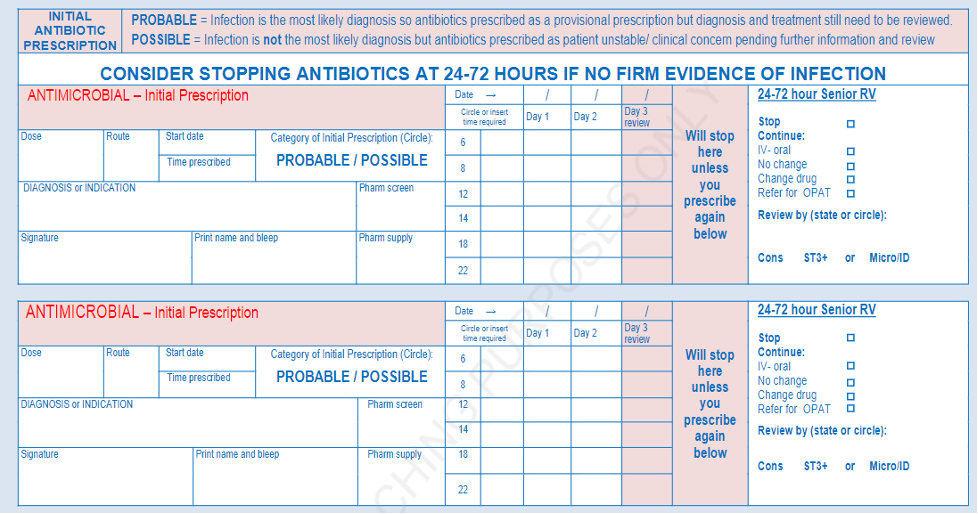 Blank prescription and justification table should you need to complete a prescription (antibiotic section of hospital chart in this case)