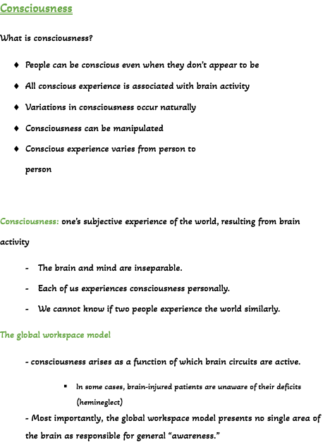 Consciousness: one’s subjective experience of the world, resulting from brain activity