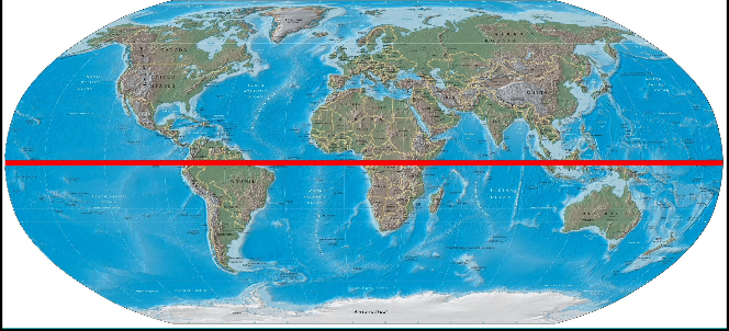 Equator: the line that runs horizontally along the center of the earth. It is equally distant from each of the poles. (0 degrees N and S)
