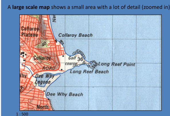 Large Scale Maps: show a large amount of detail and a small area.