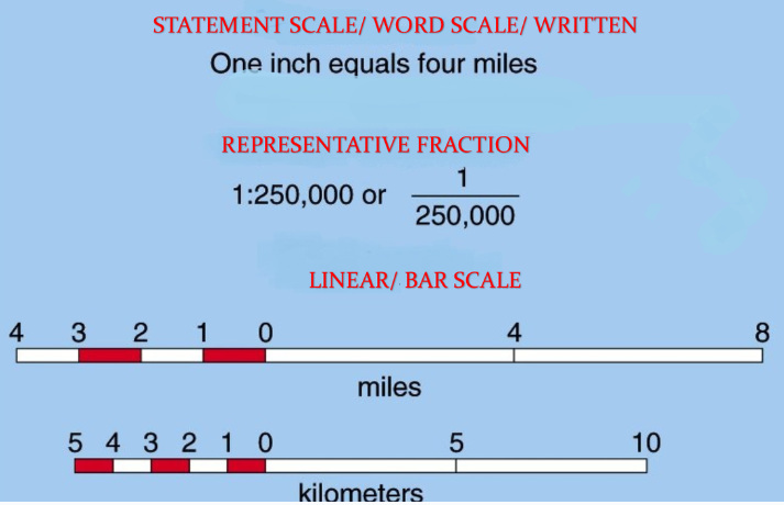 Scale is a relationship between actual distances and mapped distances. Scale can be represented in three different ways: (Pros and Cons to each)