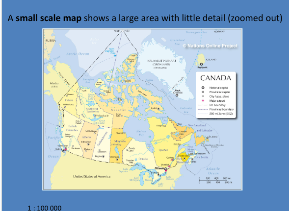 Small Scale Maps: show a small amount of detail over a large area.