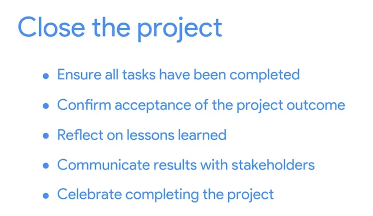 Finally, when all the tasks have been completed, all the resources have been accounted for, and the project has crossed the finish line, it's time to close the project. Why is it important to close? One big reason is that your team has a moment to celebrate all of their hard work. Closing the project is also a chance to evaluate how the project went. You can make a note of what worked and what didn't, so you can plan better for next time. Even if the project was a massive success, it's helpful to take time to reflect. Closing the project is also a great way to connect with anyone outside your team who may have had an interest in the project's goal. You can let everyone know what was completed and what you accomplished.