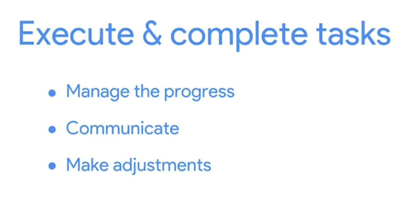 You'll make a plan for how you will meet the goals of your project. There are all kinds of ways to plan your project, and we'll get into some different methods and techniques later on. Right now, the important thing to know is that for every single project, creating a plan of how you're going to meet your goals is absolutely 100 per cent essential. Think about it. You can't hire a contractor to build a house without planning what it'll look like or how much you have to spend. These same considerations apply to any project that you manage. To be effective, your plan needs to include a lot of things. For example, a budget, a breakdown of all the tasks that you need to be completed, ways to communicate team roles and responsibilities, a schedule, resources, and what to do in case your project encounters problems or needs to change. That's just to name a few.Execute and Complete Tasks