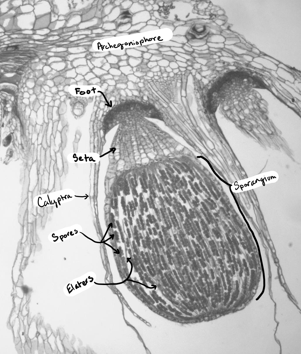 The sporangium in the mature sporophyte contains spores and elater