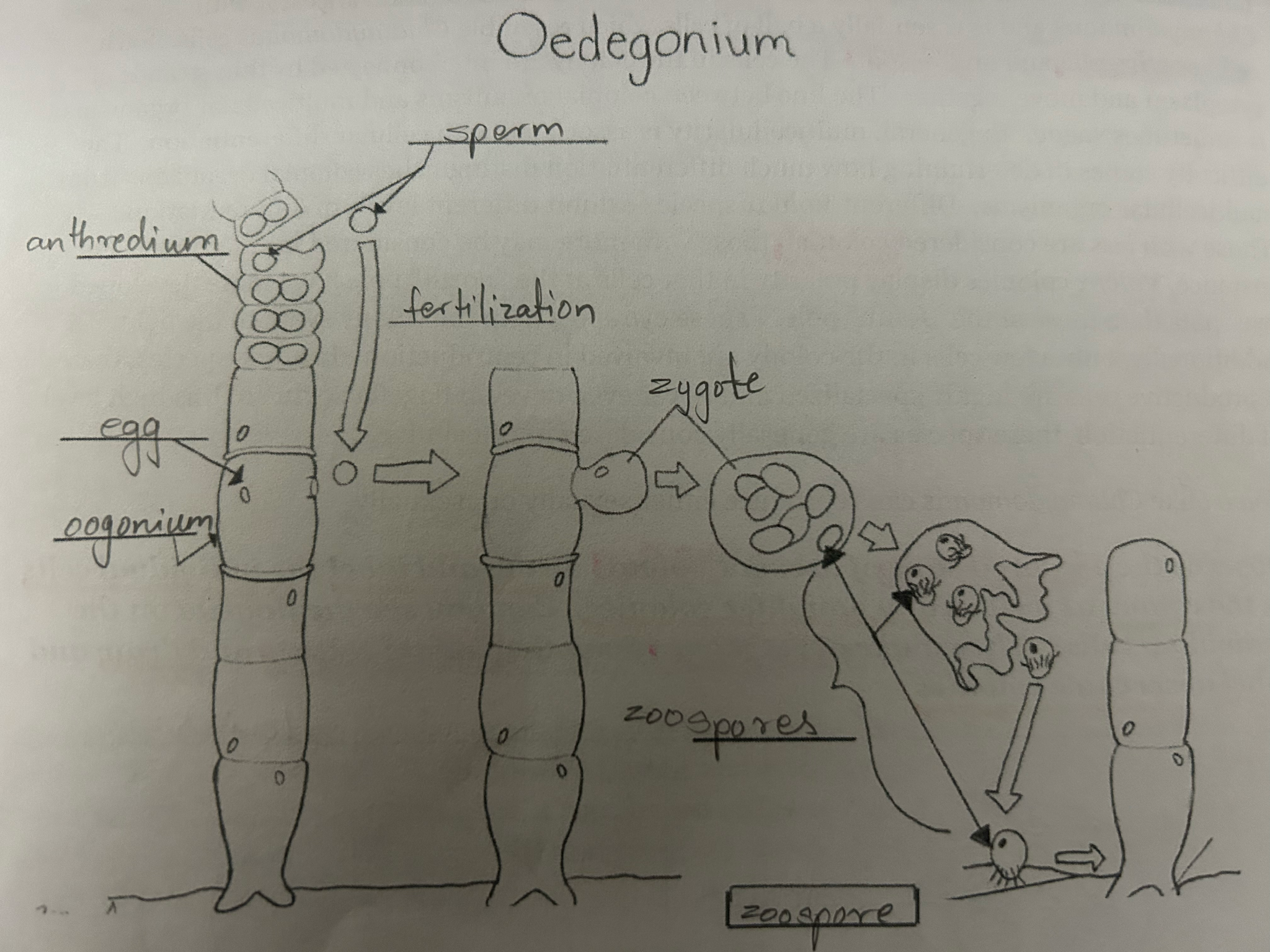 Sexual Rep: Sperm from Antheridum fertilizes an egg from an oogonium. Produces a diploid zygote which → meiosis produce haploid zoospores. The swim around → settle → undergo mitosis → form new filament.