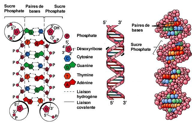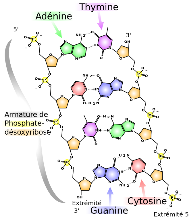 - Chacune des bases azotées peut seulement se lier à son partenaire (A=T and G=C) ceci est connu comme l’appariement des bases complémentaires ou la complémentarité des bases.
