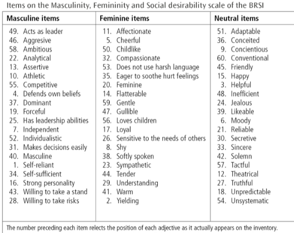 Bem’s 1974 scale presented 20 characteristics that would be commonly identified as masculine, 20 that would typically judged as feminine and further 20 neutral traits.
