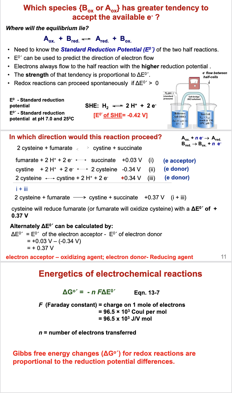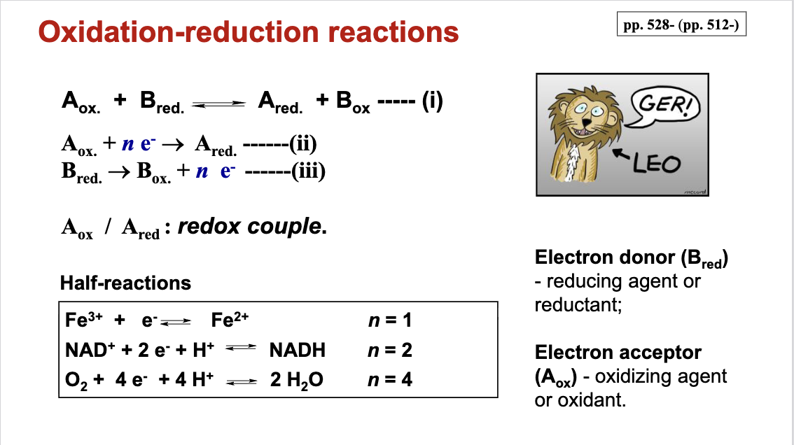 Overview of oxidation-reduction (redox) reactions, highlighting electron transfer between oxidized and reduced forms of molecules.