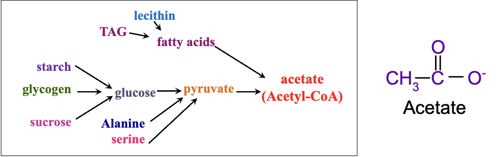 sugars, fats, and amino acids are converted into a single centrally-important metabolite, a carrier of two-carbon (acetate) units called acetyl coenzyme A (acetyl CoA).