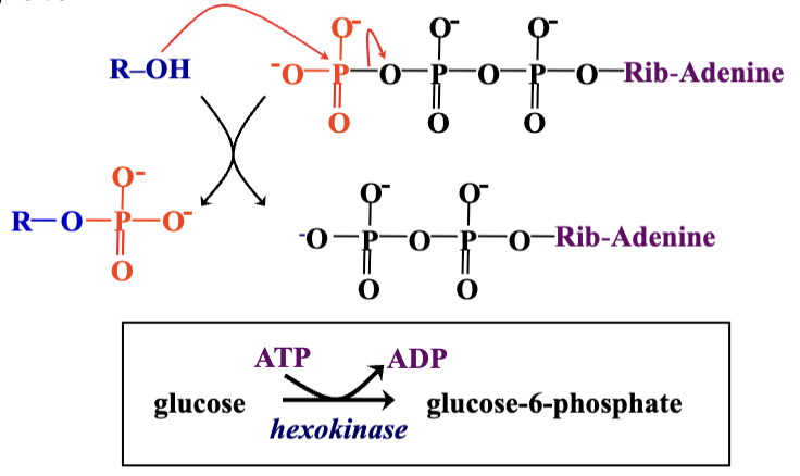 ATP Functions: Acts as an energy currency and a phosphate group donor in phosphorylation reactions, catalyzed by kinases (e.g., hexokinase for glucose phosphorylation).