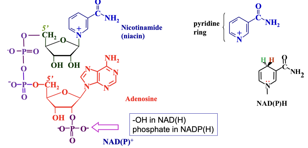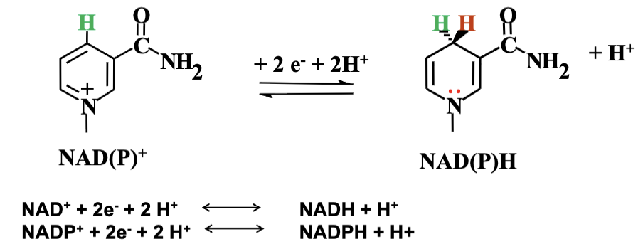 Redox Chemistry: They occur at the nicotinamide ring. Involves the removal of hydrogen atoms (1 electron and 1 proton) from the substrate, with NAD/NADP donation resulting in the formation of reduced forms (NADH/NADPH) and releasing protons.